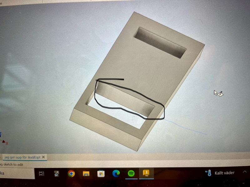 Aha, okej, så den var där hela tiden, egentligen. Men jag hade den yttre ytan ivägen. Men hur ska jag kunna dimensionera den i sketchmode om jag inte kan se den där? Jag kan ju inte sätta den på den yttersta ytan för den måste ju vara på den inre ytan eftersom hålet ska vara där?