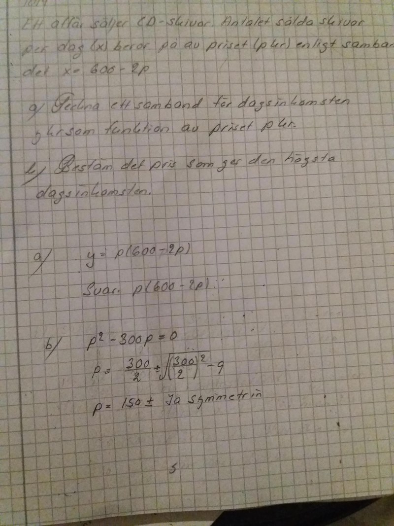 Ett annat sätt att hitta symmetrilinjen är att utgå från nollställena till y = p(600 - 2p). Om y ska vara lika med 0 så måste antingen p = 0 eller 600 - 2p = 0, dvs p = 300.