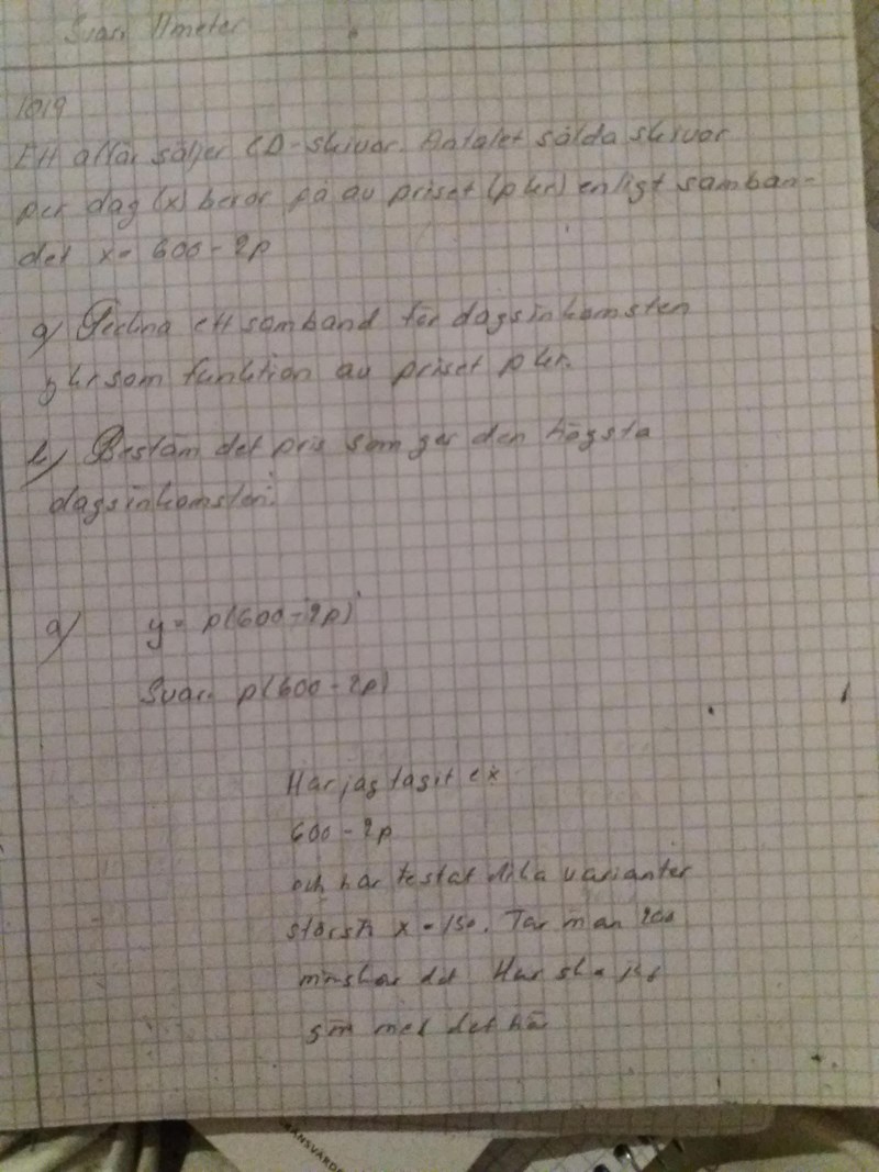 b) Det går att testa sig fram, men det tar väldigt lång tid. En bättre metod är att derivera funktionen och sätta derivatan lika med noll.