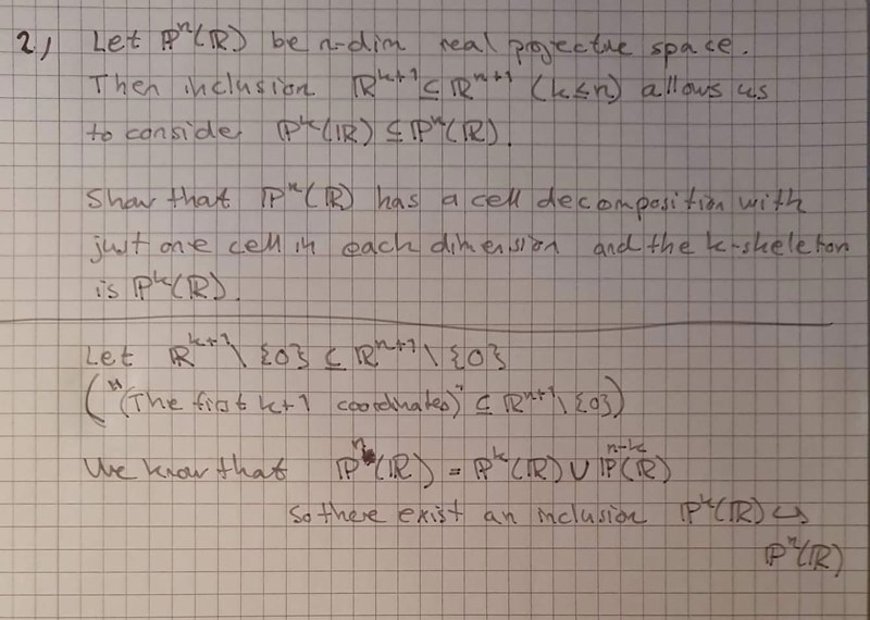 Min uppgift och min lösning. Jag vet att det projektiva rummet i n dimensioner är unionen av de affina rummet i n dim, n-1 dim och så vidare plus "punkten i oändligheten". Vet dock inte hur jag ska applicera det på denna uppgift?