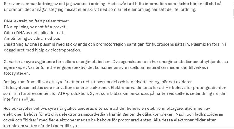 Förstår det, tänkte att huvudanledningen till att jag ska komplettera är att jag skrivit fel processer eller fel ordning. Kan skriva ut mer utförligt om du vill :). Tänkte inte ens på att utveckla patientprovet-processen i min ordinarie text så det ska jag skriva om nu, tack!