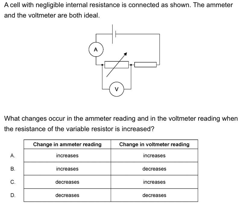 Rätt svar är C, jag förstår varför strömmen skulle minska, men varför skulle spänningen öka?