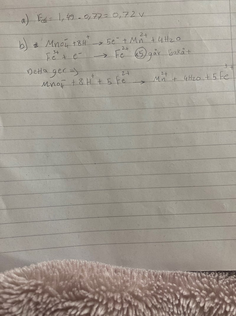Halvcellpotentialen är 1,49 V för MnO4(aq) + 8H*(aq) + 5e → Mn2+ 4 H₂O(1) och 0,77 v för Fe3+(aq)+e