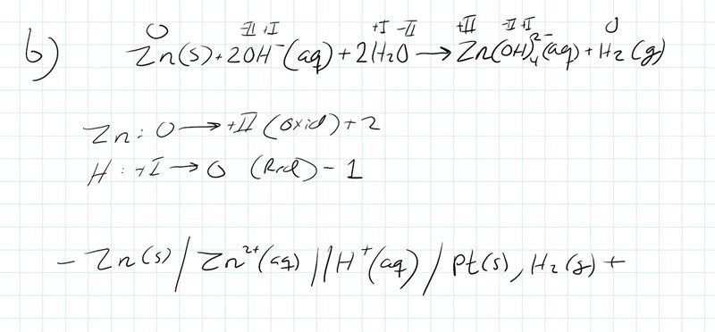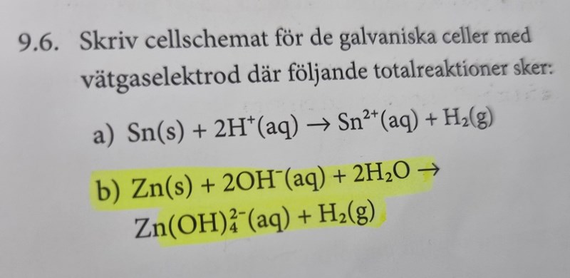 Hej, jag fattar inte riktigt b-uppgiften alls här. Som jag löser den, så skriver jag upp reaktionen med oxidationstal och tittar på vad som oxideras respektive reduceras. Och tar bara med dom i cellschemat som ni kan se i min lösning. Men som ni ser i den understa bilden så är det på ett annat sätt enligt facit. Är min lösning helt fel, och vad har jag isåfall missuppfattat?