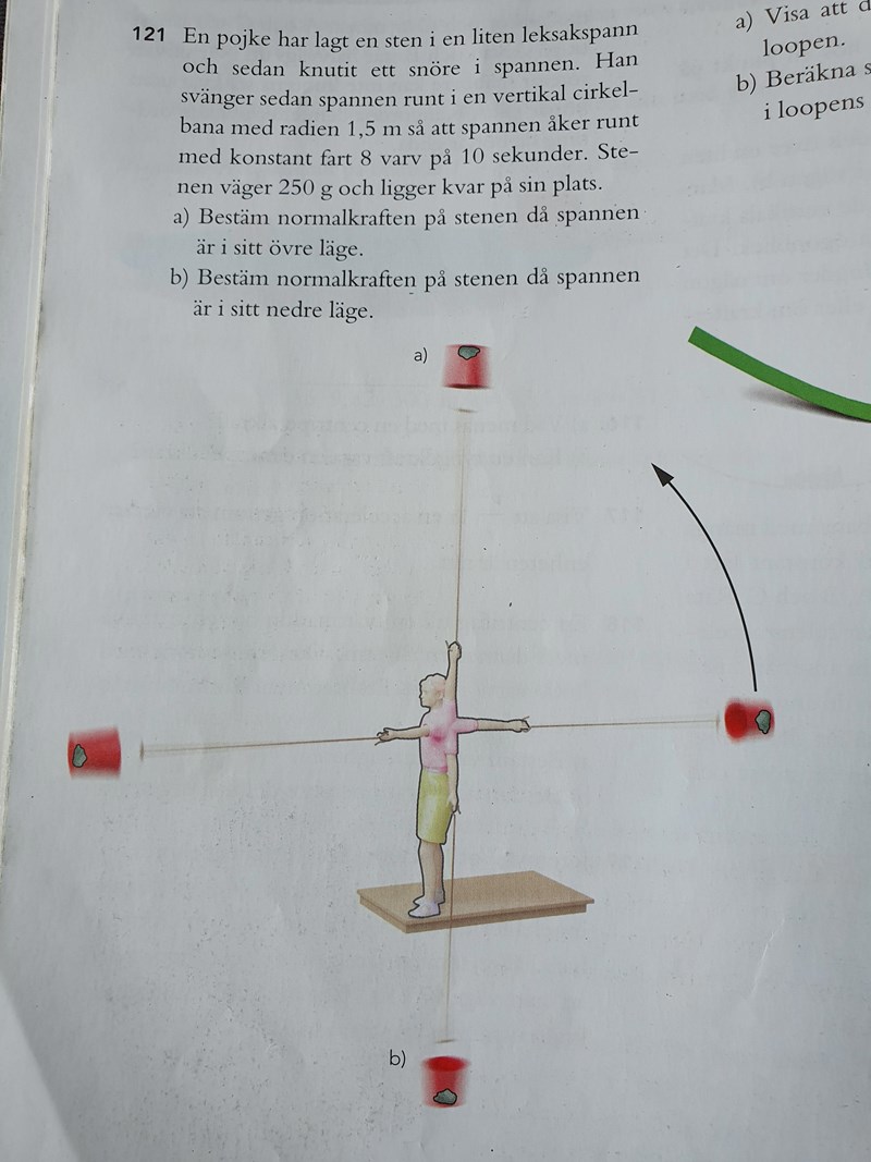 Det du beräknar med w^2 * m * r (centripetalkraften) är egentligen en kraftresultat, summan av alla krafter som verkar på stenen i läge a) . Rita ut vilka krafter som verkar på stenen i läge a), använd Newtons andra lag för att få en ekvation med den okända normalkraften. Uttryck sedan normalkraften i den beräknade centripetalkraften och gravitationskraften.