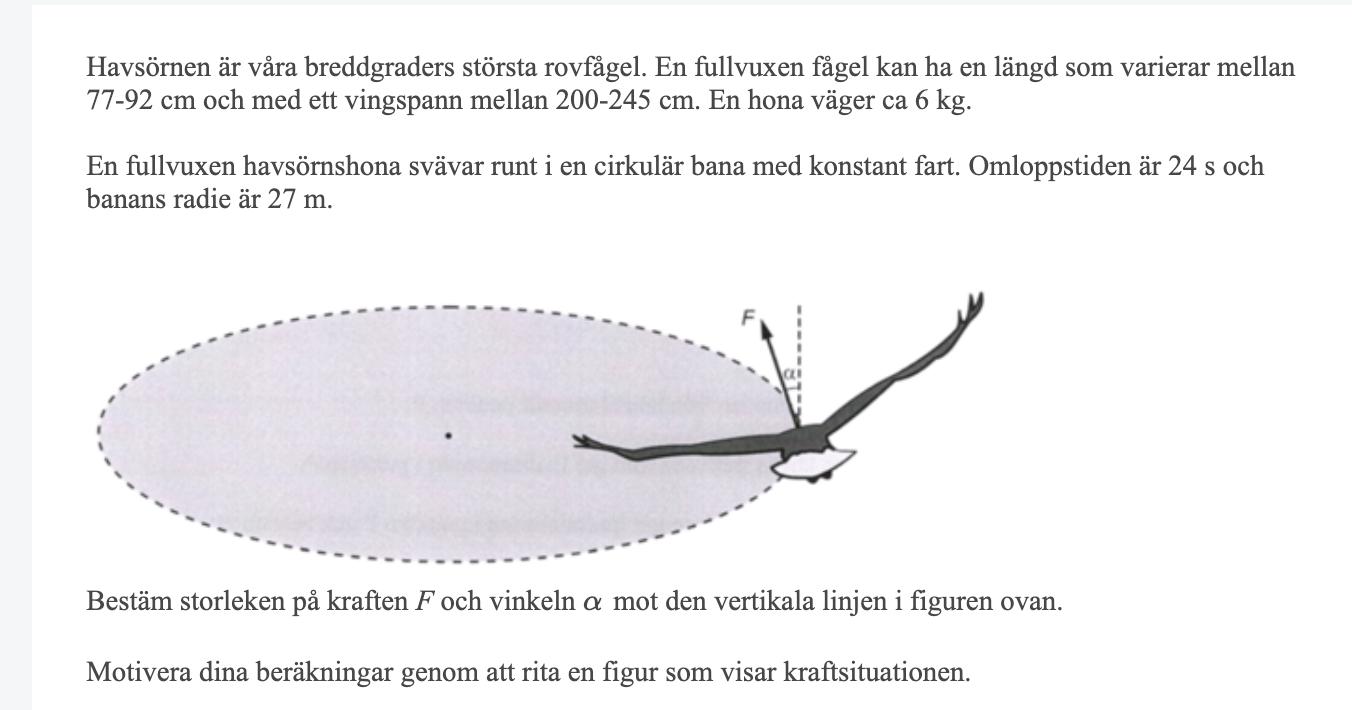 Uppgiften vill nog att man antar att havsörnen har en roll angle i kurvor som är parallel med kraften men jag vet inte om fåglar egentligen flyger på det sättet. Det är kanske inte på samma sätt som när man cyklar...