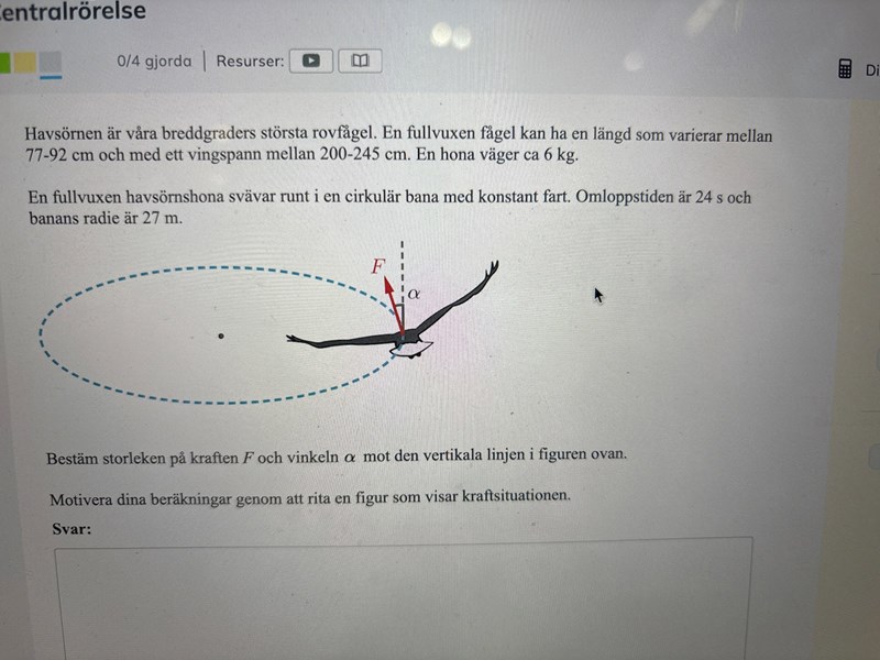 Jag förstår att man ska använda centripetalkraft osv. Men jag använder varianten utan hastigheten men får fel svar. Varför måste jag använde F=mv^2/r och inte F=m4pi^2r/T^2. Vad är skillnaden mellan dom två formlerna? Dessutom undrar jag om det är rätt av mig att skriva F=Fg+Fc, eller krävs pythagoras?