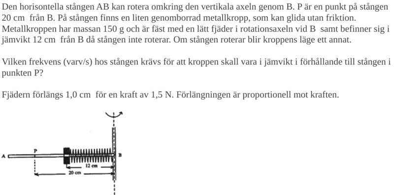 Jag har försökt lösa den här uppgiften, men jag får fel svar. Jag får att frekvensen blir 1,43 Hz men i facit står det 3-3,2 Hz.
