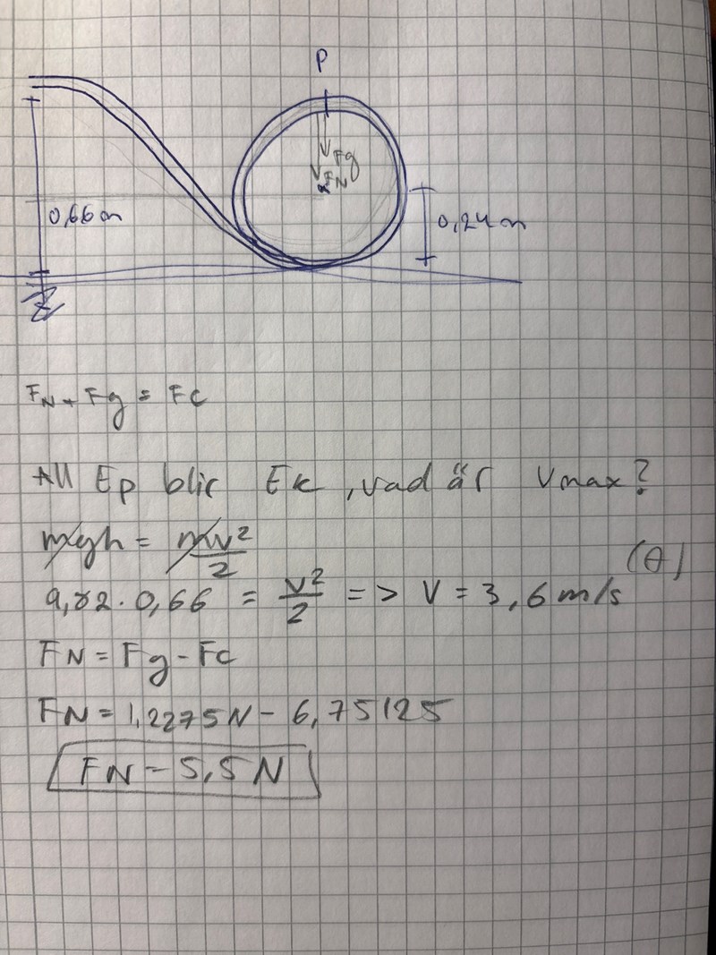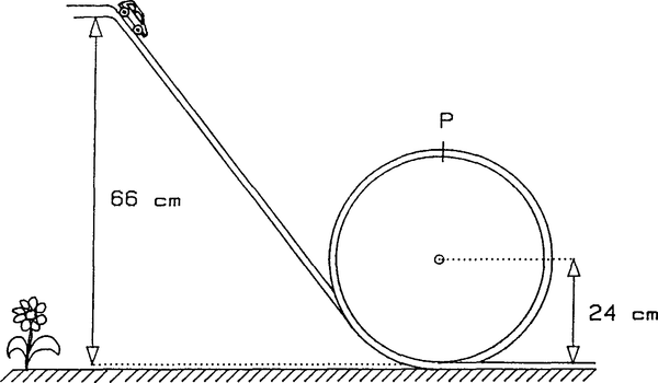 Figuren visar en bilbana som innehåller en cirkulär slinga med radien 24 cm. En liten bil (punktformig) med lätta hjul släpps från ett läge 66 cm ovanför banans lägsta punkt. Bilen väger 125 g.
