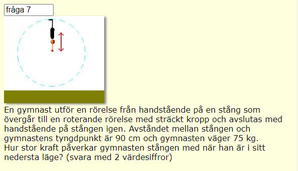 Centripetalkraften är kraften gymnasten måste utföra för att hålla sig i cirkelbanan. I det nedersta läget behöver den utföra hela denna kraft + hela sin tyngd. Således blir beräkningen mg+Fc.