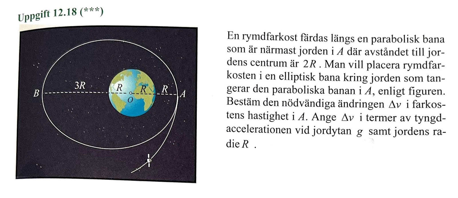 Jag har försökt lösa den här uppgiften genom att använda bland annat energiekvationen, kraftekvationen och även att energin på parabeln är noll. Det jag fastnar på är att vi inte vet avståndet från satelliten i början, och mitt försök att lösa ut den har inte lett nån vart. Behöver hjälp med hur jag kan tänka.