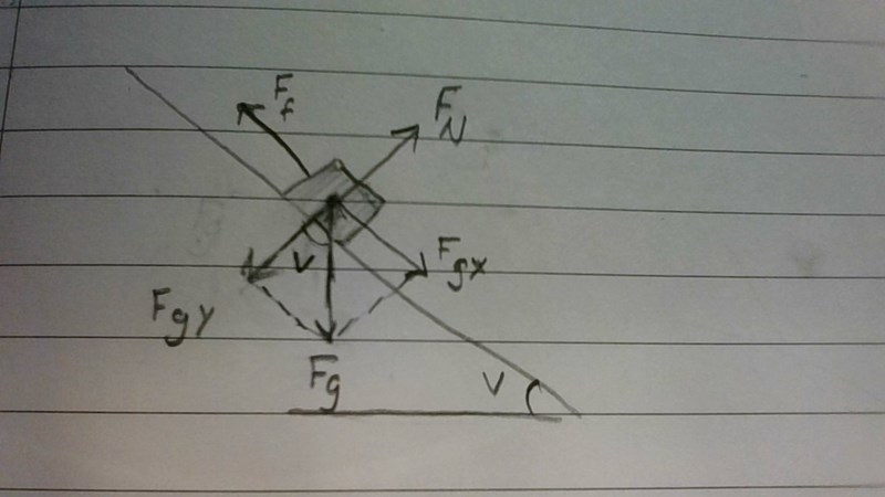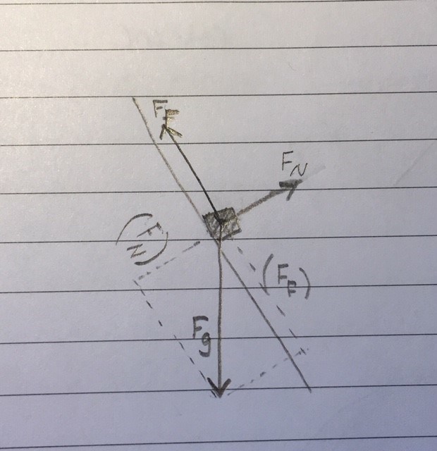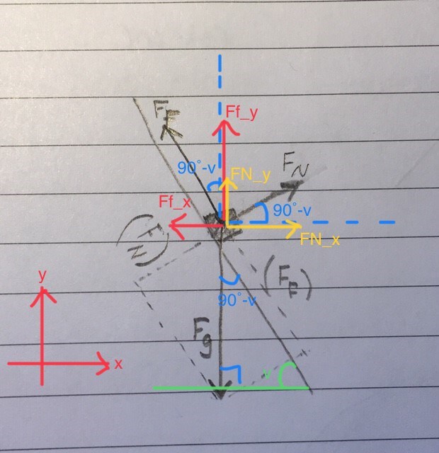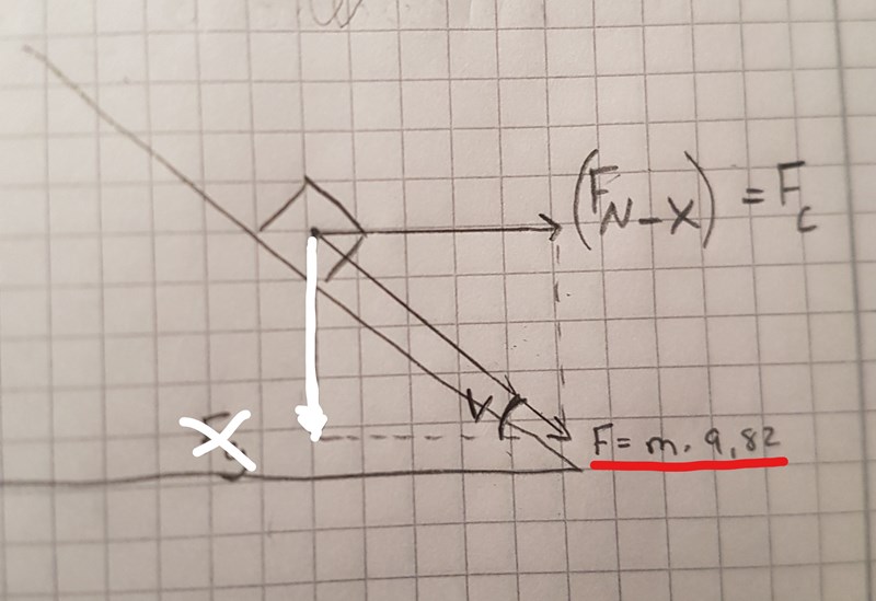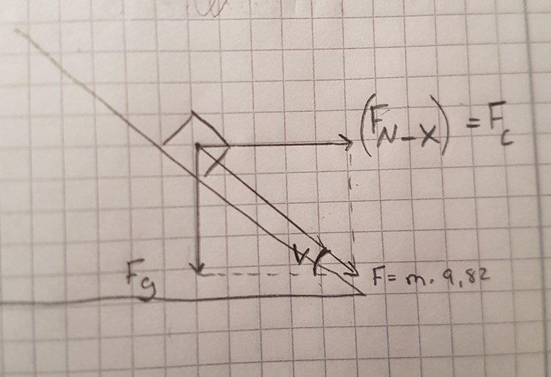 Försökte rita en bild av hur det blir efter tyngdkraften och normalkraftens y_komposant tagit ut varandra. Kan man verkligen ha både komposanterna till och själva kraften samtidigt? Förstår inte hur ekvationen ska se ut om jag ska räkna ut vinkeln från detta...