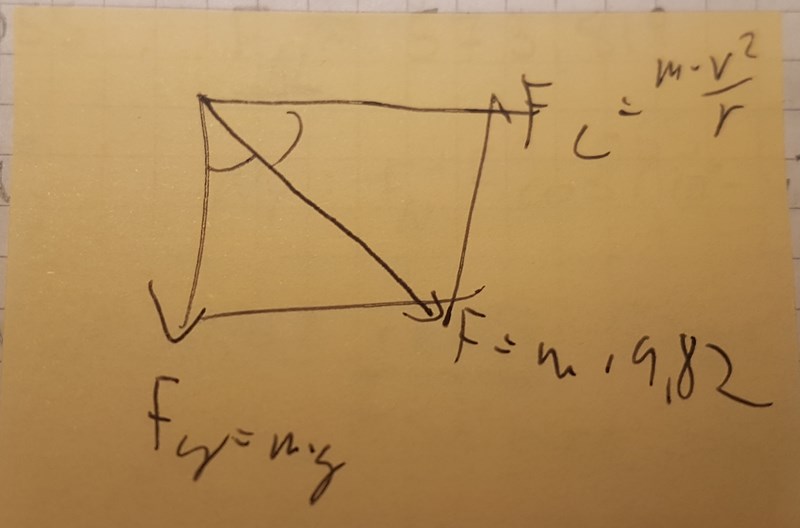 Okej, så kraftresultanten för alla tre krafterna är alltså centripetalkraften? Men jag förstår tyvärr inte riktigt vad som händer med centrifugalkraften? Och hur vet man hur mycket "golvet" ska luta?