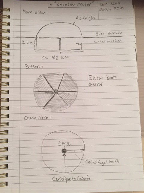 Teraeagle skrev:Okej, då förstår jag hur du menar. På bilden har du ritat in att personen står på väggen, men man kommer ju fortfarande att utsättas för Mars gravitation (riktad nedåt), så man kommer att trilla ner från väggen. Hur tänker du att man ska komma runt det problemet? Den där typen av lösning hade kunnat fungera i rymden där man är tyngdlös, men det blir problematiskt på en planetyta.