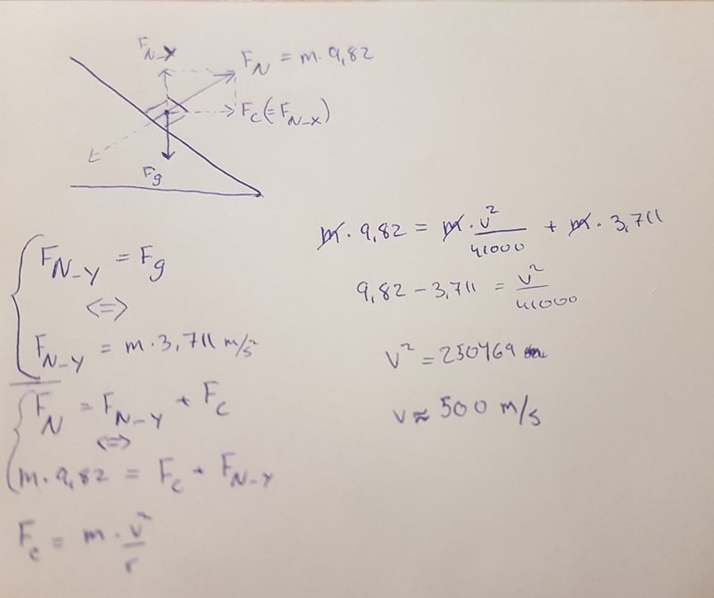 Teraeagle skrev:Nej det är fel. Det är centripetalkraften som ska motsvara mgjorden och inte normalkraften. Du ska räkna ut den hastighet som gör att Fc=mgjorden och sedan använda den hastigheten i kraftjämvikten för att bestämma golvets lutning, vilket du helt verkar ha försummat nu helt plötsligt.