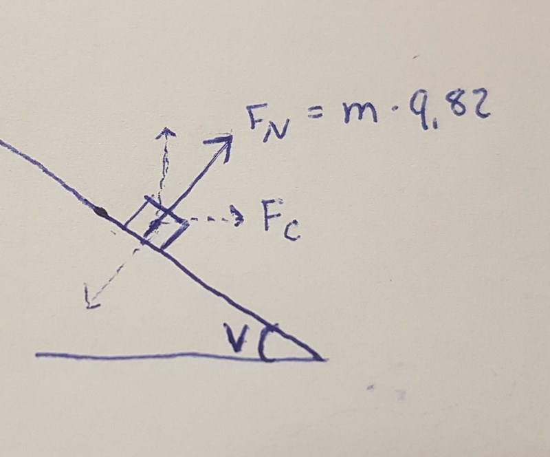 Teraeagle skrev:Normalkraftens x-komposant motsvarar centripetalkraften och y-komposanten balanserar tyngdkraften (som du inte har ritat ut).