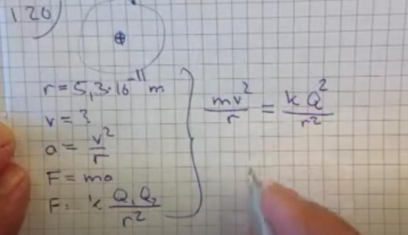 I en enkel modell av en väteatom kan man se elektronen röra sig runt protonen i en cirkelbana med radien 5,3 · 10^-11 m. hur stor är elektronens hastighet i banan?