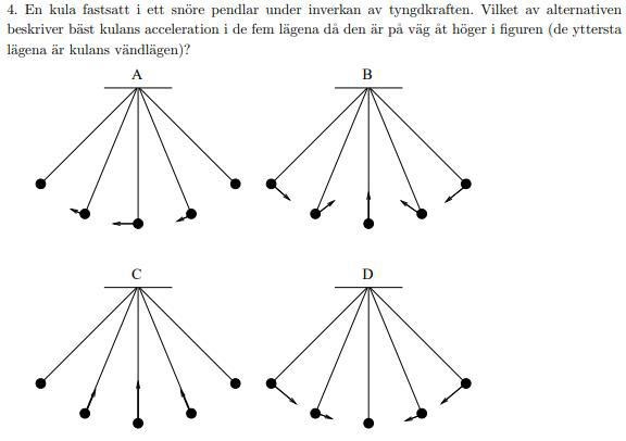 Hur skulle resonemanget se ut för att förklara varför B) är rätt svar? Personligen tänkte jag mig att centripetal acceleration alltid är riktad in mot centrum. Kan det vara så att pilarna är sneda i B) eftersom det är resultanten av accelerationer?