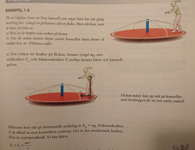 I ditt fall kommer friktionskraften tillslut inte att hålla, och flickan kommer att ramla av. Den kraft som ger upphov till rotationen är från början den kraft som ger upphov till friktionskraften på flickan. Så länge den är tillräckligt stor håller hon sig kvar på karusellen.