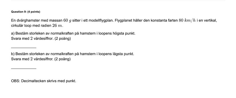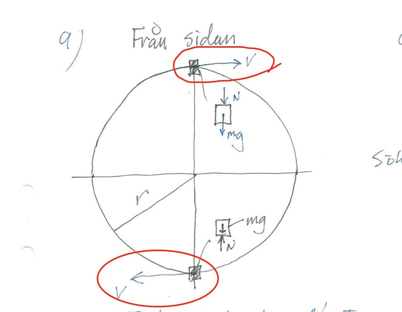 Hastigheten har väl inte någon typ, men du syftar nog på rörelsens typ och den är cirkulär och då kommer centripetal-/centrifugalkraft in i beräkningen. Din figur är i princip OK. I det undre läget samverkar tyngdkraft och centrifugalkraft, i det övre läget motverkar de varandra.