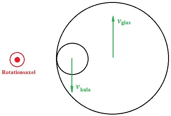 Där alltså den streckade linjen till vänster är rotationsaxeln för glaset, vglasv_{glas} är glasets hastighet vid denna tidpunkt som är riktad in i bilden (kulans hastighet vkulav_{kula} är riktad ut ur bilden). Detta ser ut som följer ovanifrån: