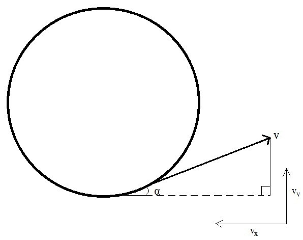 Kulans rörelseriktning kan delas upp i x-led och y-led. Kulan har i varje moment riktningen v och rörelsens y-komponent ges av vy = v sin α och x-komponent vx = v cos α