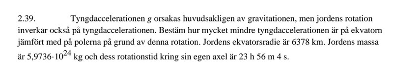 Eftersom en del av gravitationskraften måste agera centripetalkraft får man vid ekvatorn kvar: