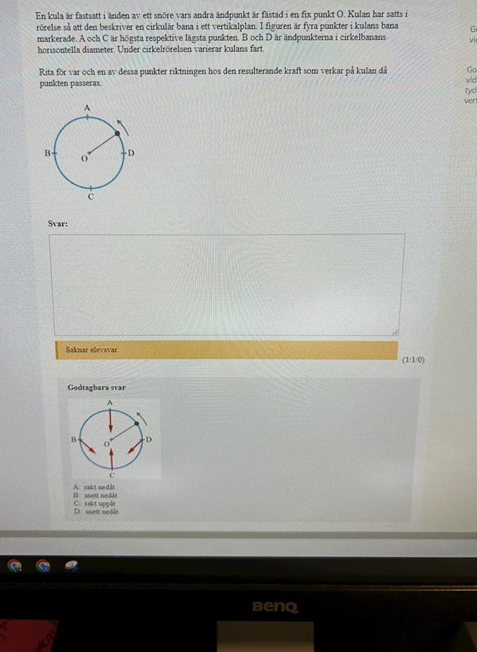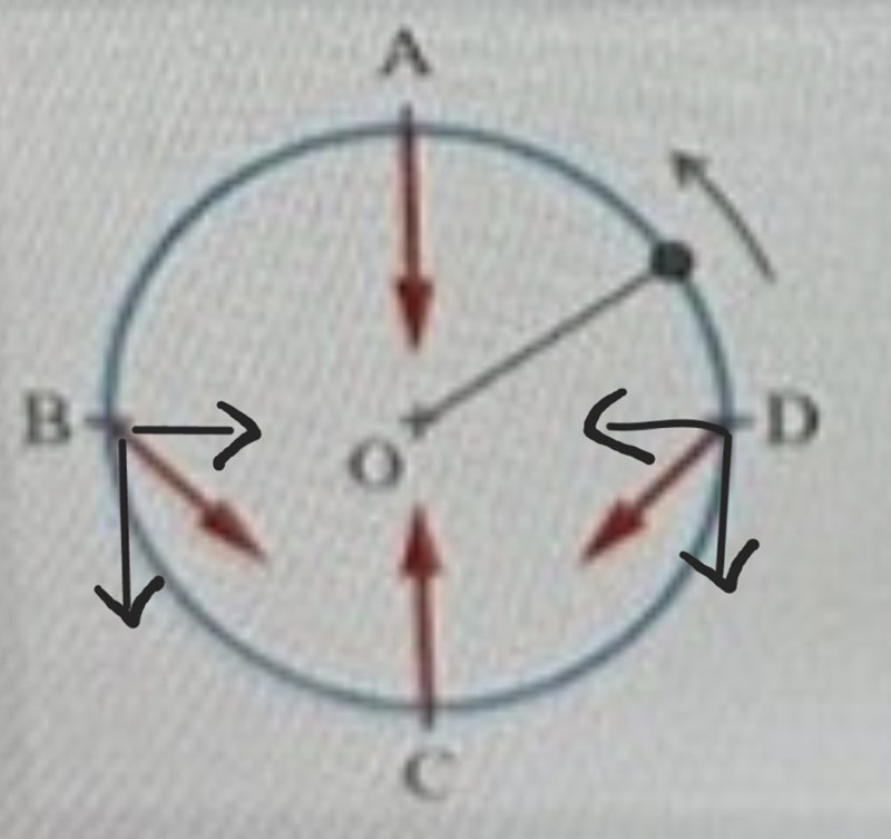 aha .. men jag förstår verkligen inte den här uppgiften :( Är det här en del av centralrörelse? För hittils har jag bara använt kunskap om centripetalkraften som är riktad in mot centrum. Vad kallas det här fenomenet. Och hur är pilen vid D och B tangenter till hastigheten?