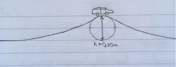 En leksaksbil med små lätta hjul sätts i rörelse och rullar med hastigheten v mot en uppförsbacke med höjden 0,20 m. Överst är backen cirkelformad och därefter följer en nedförsbacke. Mellan vilka gränser skall hastigheten v ligga om bilen skall kunna passera backarna och ha full kontakt med underlaget hela vägen? Man kan bortse från luftmotstånd och bromsande friktion.
