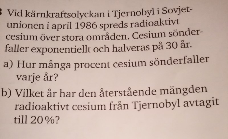 Smaragdalena skrev:Nichrome skrev:Laguna skrev:Det är rätt, men det är andelen som är kvar, inte den som sönderfallit. Vad blir svaret i procent?