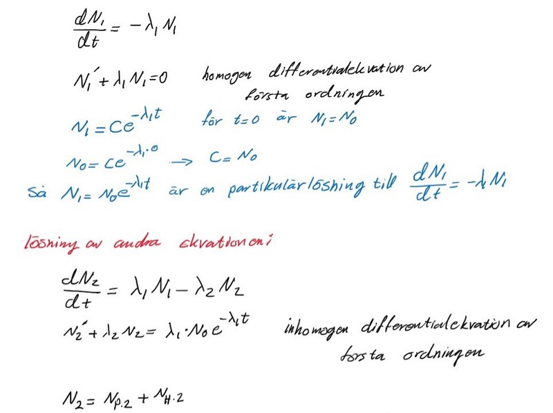 Just det! Lösningen för N2 ska då bli: N2=λ1N0λ21-e-λ2t, om man löser ut C. Gör man inte det och man är ute efter samtliga lösningarna, då får det bli: N2=λ1N0λ2 e-λ1t-C e-λ2t
