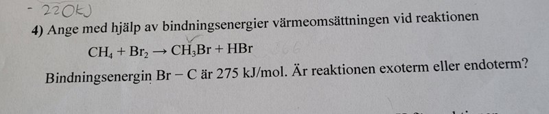 Bindningar bryts: 1 st C-H, 413, 1 st Br-Br, 193, totalt 606 kJ/mol