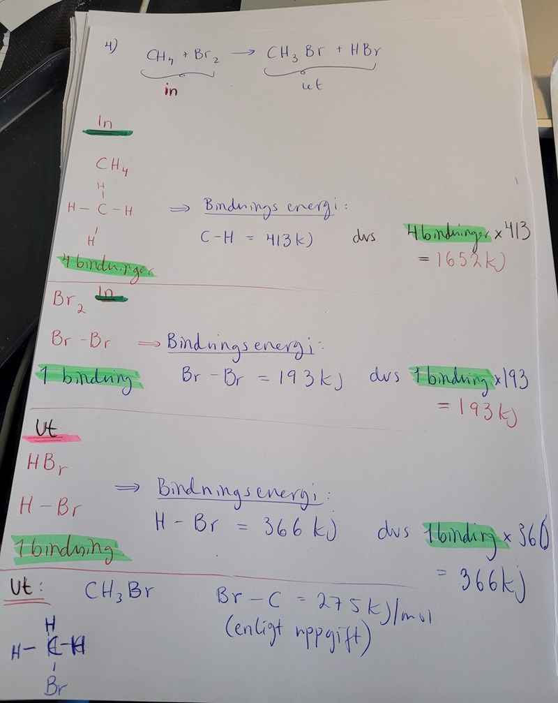 Tre av  bindningarna C-H är samma både före och efter reaktionen, så jag tycker det känns onödigtatt först  bryta dem och sedan återbilda dem - men om man bara räknar rätt så funkar det lika bra att bryta 4 bindningar C_H och en H-Br Nej, Br-Br och sedan bilda 3 bindningar C-H, en bindning C-Br och en bindning  H-Br.