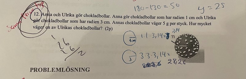 Är det här universitetsmatte? Jag tror det är i högstadiet man lär sig att volymskalan är längdskalan upphöjt till 3. En av Ulrikas chokladbollar väger alltså lika mycket som 9 27 av Annas chokladbollar.