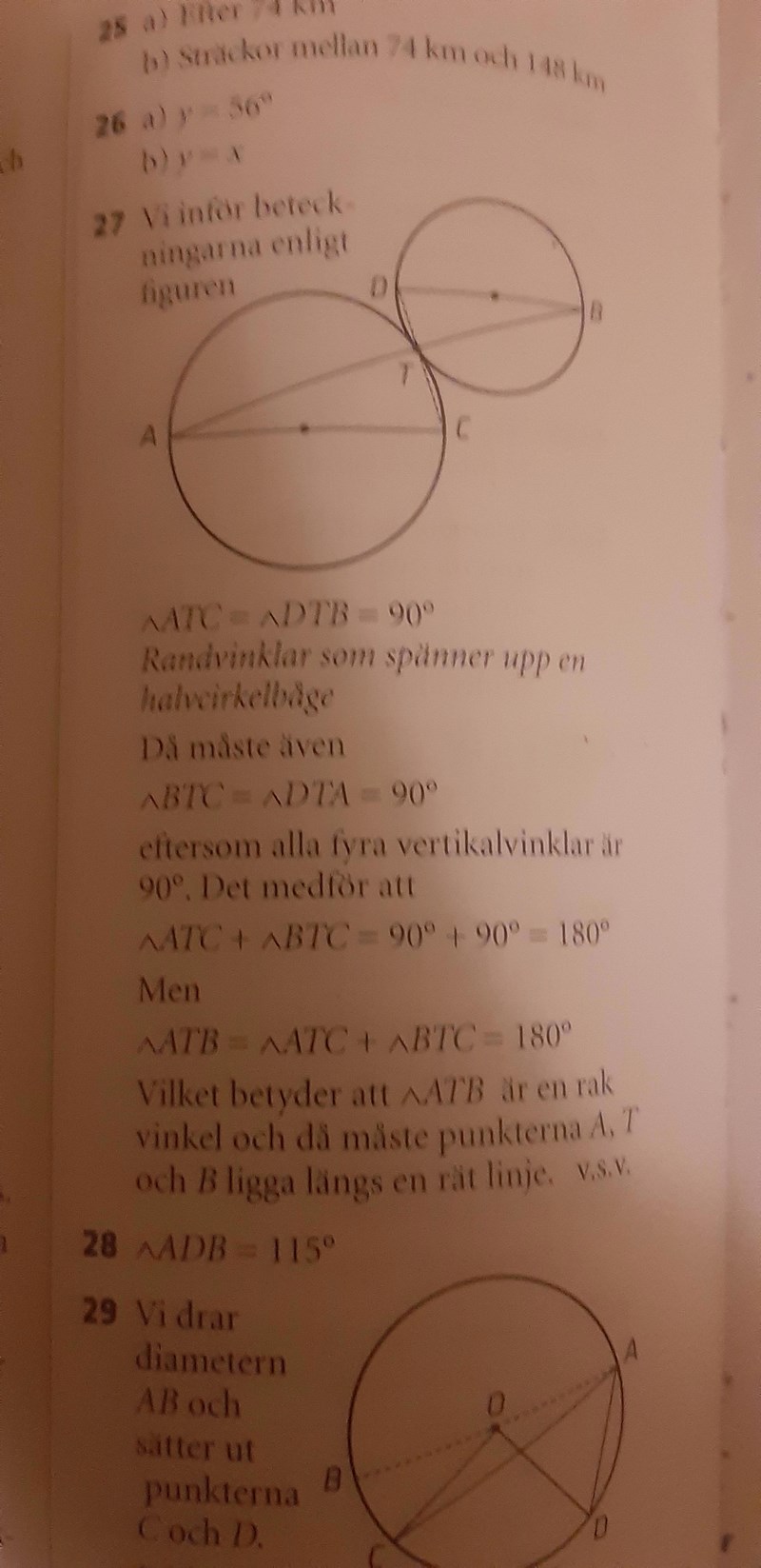 Okej, det har jag fattat nu men på facit står det att de gör en linje från den motsatta sidan av B på diametern till den motsatta sidan av A på diametern i den cirkeln under. Sedan får de 90 grader vinkel mellan den nya linjen och diametern. Det som händer efter det tills svaret har jag fatta men hur kan man veta den linjen som bildas är 90° vinkel.