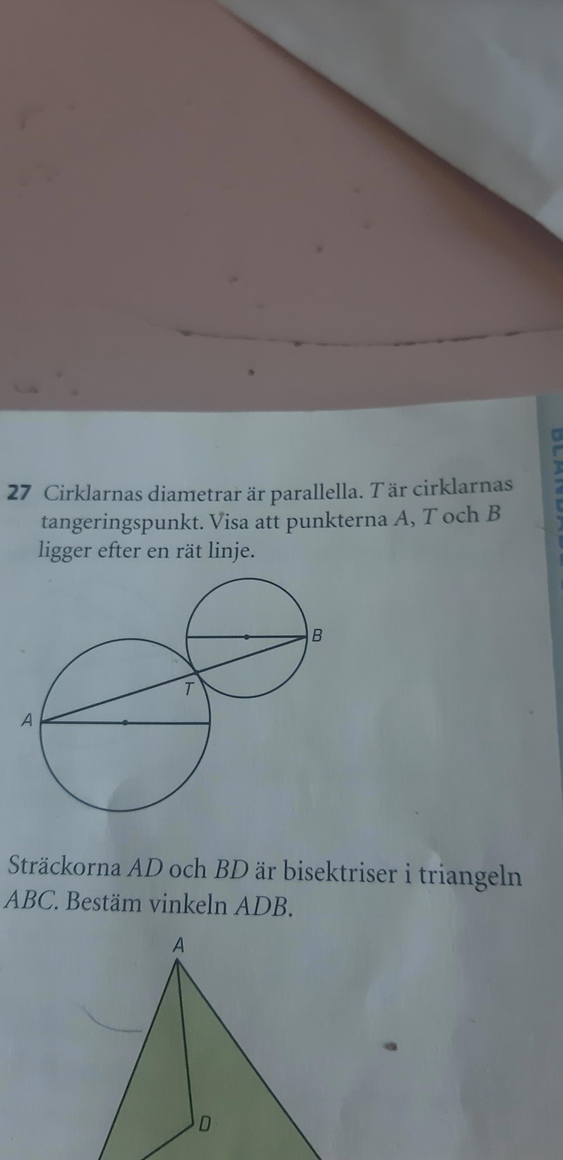 Tänk randvinkelsatsen vid T och cirklarnas mittpunkter