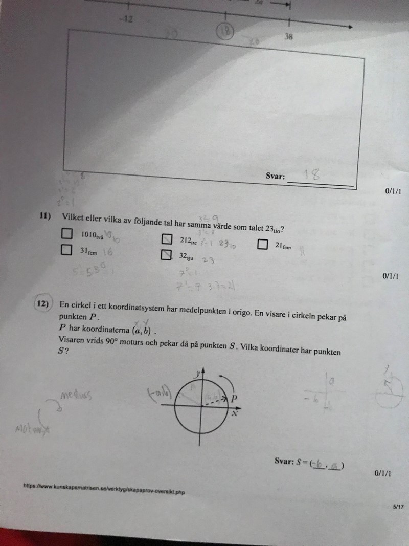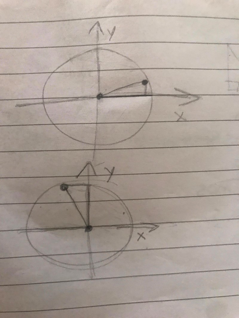 Jag behöver hjälp med uppgift 12, cirkel. Jag tänker så här, om man ritar ut ett sträck åt det motsatta håller från origo alltså P spegelbild. Så hade det väl blivit (-a,b). Men när P rör sig 90 grader så blir svaret (-b,a). Jag förstår inte varför a och b byter plats?