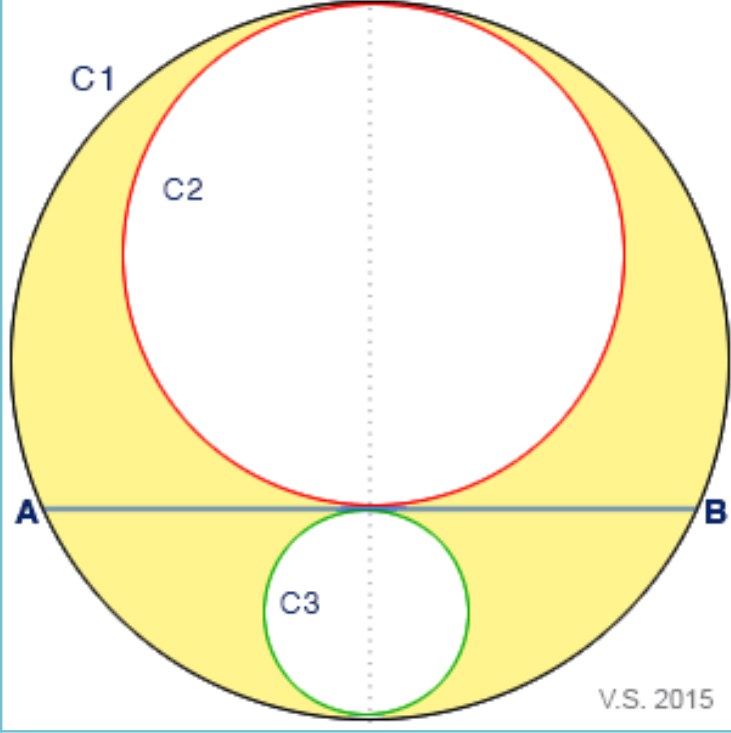 Inuti en cirkel (C1) skrivs två andra cirklar in (C2 och C3) som ligger symmetriskt utefter den stora cirkelns diameter så att de mindre cirklarna precis tangerar varandra och den yttre cirkeln C1 (se figur 1). Mellan de båda inre cirklarna (C2 och C3) dras tangenten AB. Den gulmarkerade arean mellan cirklarna C1, C2 och C3 är 2pi cm2