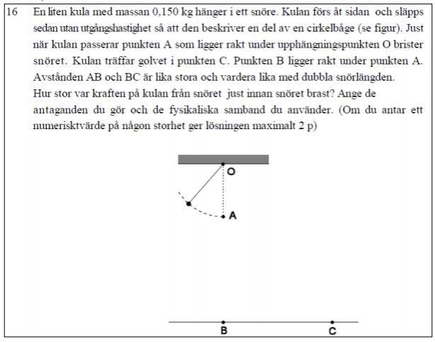 Genom att räkna med denna kaströrelse hoppades jag på att få en hastighet vilken kulan lämnar läget då snöret går sönder (vx) med samt en längd på snöret (x) och då kunna räkna ut centripetalkraften via Fc=m*v²/r. Via detta hoppades jag på att kunna beräkna spännkraften via sambandet för kraftsituationen som råder då centripetalkraften är den resulterande kraften till spännkraften och tyngdkraften, Fc=Fs-Fg. Det jag har kommit fram till är att vi förmodligen måste anta någon storhet för att lösa problemet? I uppgiften framgår det att om man antar ett numeriskt värde på någon storhet så ges maximalt 2p på uppgiften vilket jag tolkar som att det går att få mer genom en rent generell lösning?