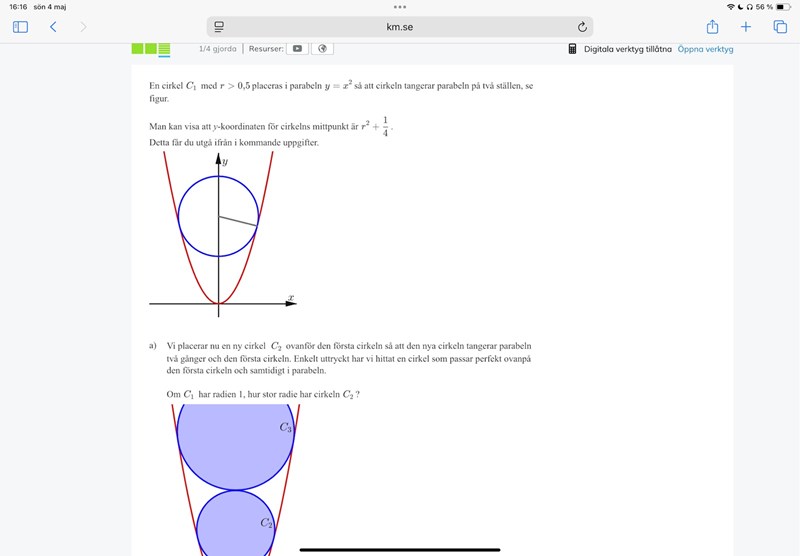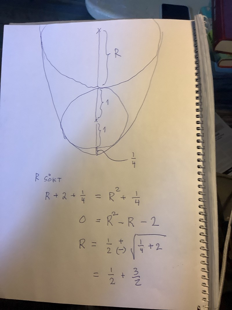 hej jag förstår inte riktigt hur radien kan vara lika med 1, men om ett streck dras ut från cirkelns mittpunkt till randen där parabeln tangeras, kommer detta streck inte vara lika med 1… eller tänker jag fel?