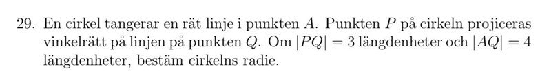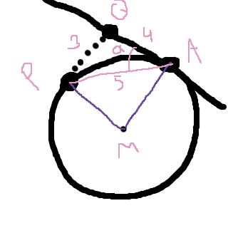 Vinkeln MAQ är 90 grader eftersom linjen är en tangent till cirkeln, och då kan vi beräkna storleken hos vinkeln alfa. Därefter kan vi använda trigonometri för att hitta r. :)