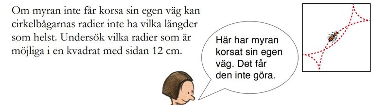 Om de stora cirkelbågarna ej ska korsa varandra så kan radien vara max så stor att bågarna möter/tangerar varandra i mitten på kvadraten.