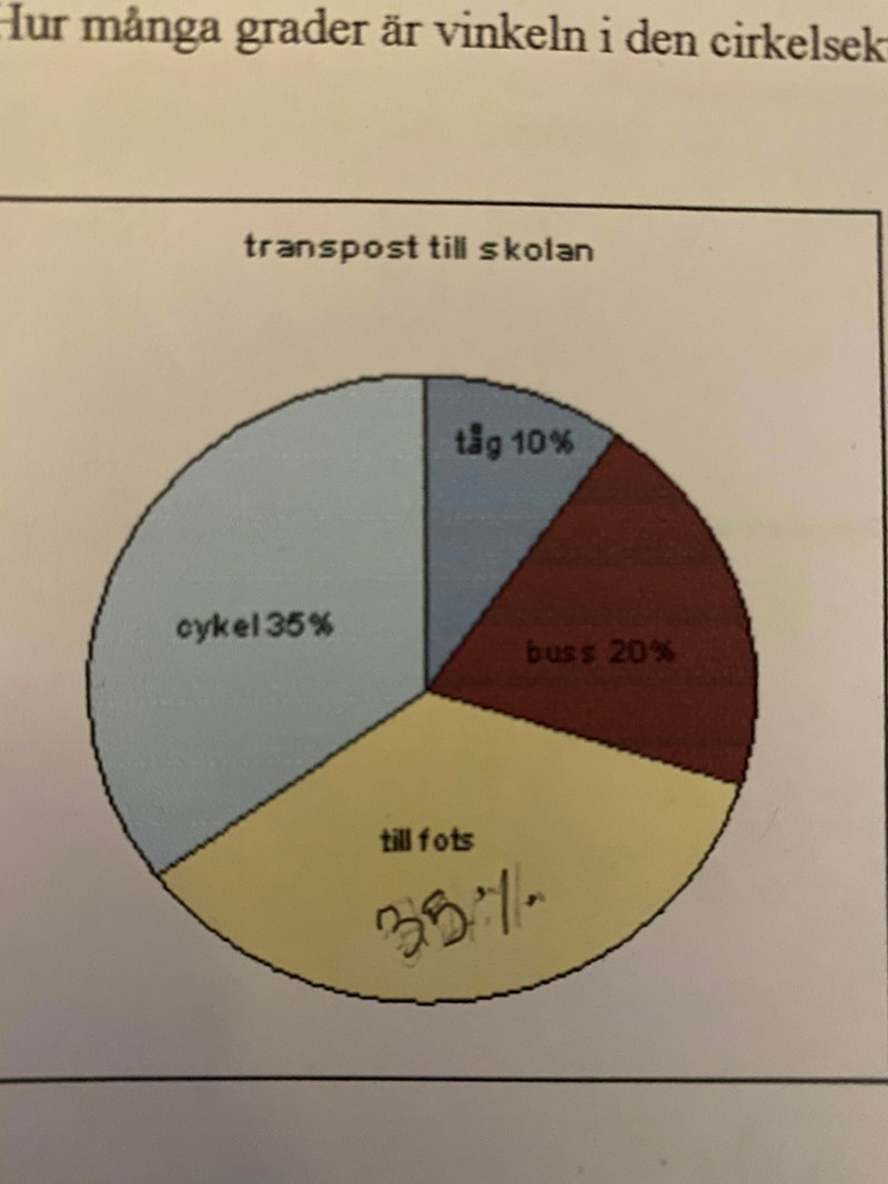 c) Hur många grader är vinkeln i den cirkelsektor som visar hur många som åker buss?