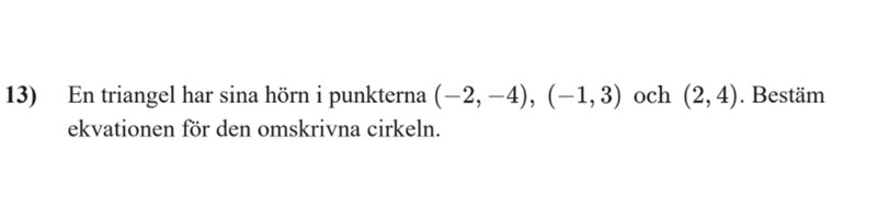 Jag skulle ta reda på var mittpunkten för de tre sidorna är, konstruera funktionerna för de tre normalerna och beräkna var de skär varandra (det borde räcka att använda sig av två av dem). Då får jag fram koordinaterna för cirkelns mittpunkt. Sedan skulle jag använda avståndsformeln för att beräkna cirkelns radie och därefter kan jag svara på frågan.