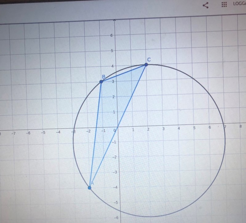 Stoppade in punkterna i geogebra och fick ut ekvationen (x-2)^2 + (y+1)^2= 5^2 vilket är det rätta svaret men behöver hjälp med uträkningen