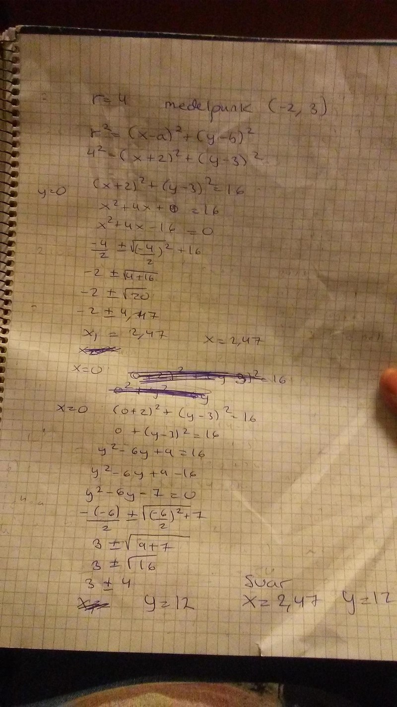 Hej matteupp95, meningen med Pluggakuten är at du skall få den hjälp du behöver för att kunna lösa dina uppgifter själv, inte att någon annan skall servera dig färdiga lösningar på dina froblen - även om det nästan är det som Jonis10 har gjort. Försök nu att sätta in dina värden på x0 x_0 , y0 y_0 och r r i formlen som Jonis10 har serverat!