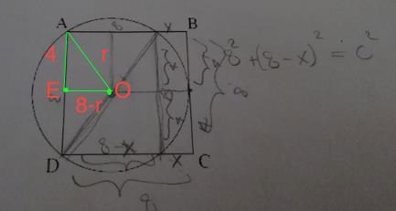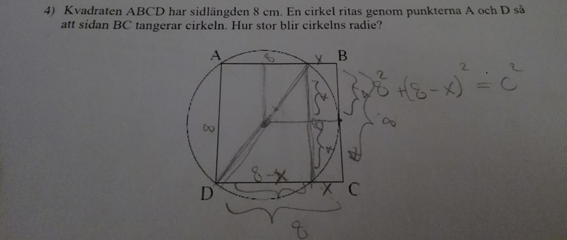 Jag måste erkänna att jag tycker det här var ett väldigt svårt enkelt problem. Jag blev irriterad på hur svårt det var att hitta en lösning. Ett av skälen är nog att man lockas att leta i det man tycker är det intressanta området till höger; och det går säkert att hitta en lösning så också. Mitt tips är dock att du tittar på triangeln som bildas mellan punkterna A, mittpunkten på sträckan AD, som vi kan kalla E, och cirkelns mittpunkt som vi kan kalla O. Där har vi ju längderna OA som är r (den sökta radien), AE som är 4 (hälften av kvadratens sidlängd). Om du börjar där så tror jag du ror hem den sen.
