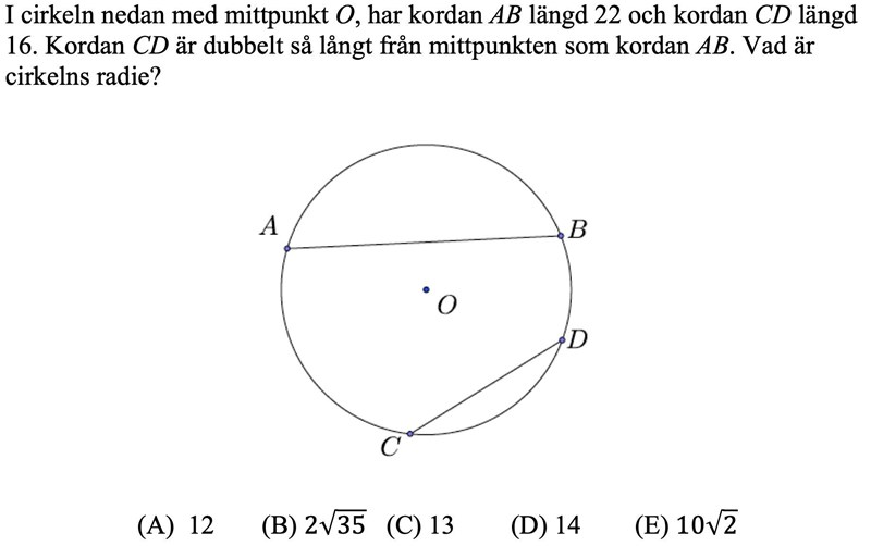 Jag kom fram till samma svar som ditt facit, för övrigt, med hjälp av Pythagoras sats. Det bygger på att man vet att avståndet från en korda till cirkelns mittpunkt mäts vinkelrätt mot kordan(s mittpunkt).