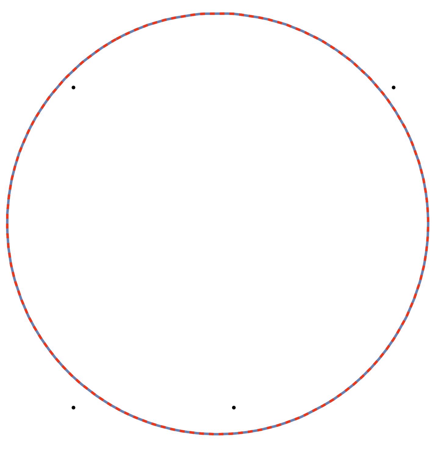 Så här blir det, med röd streckad = cirkel från kvadrakompl. ekvation