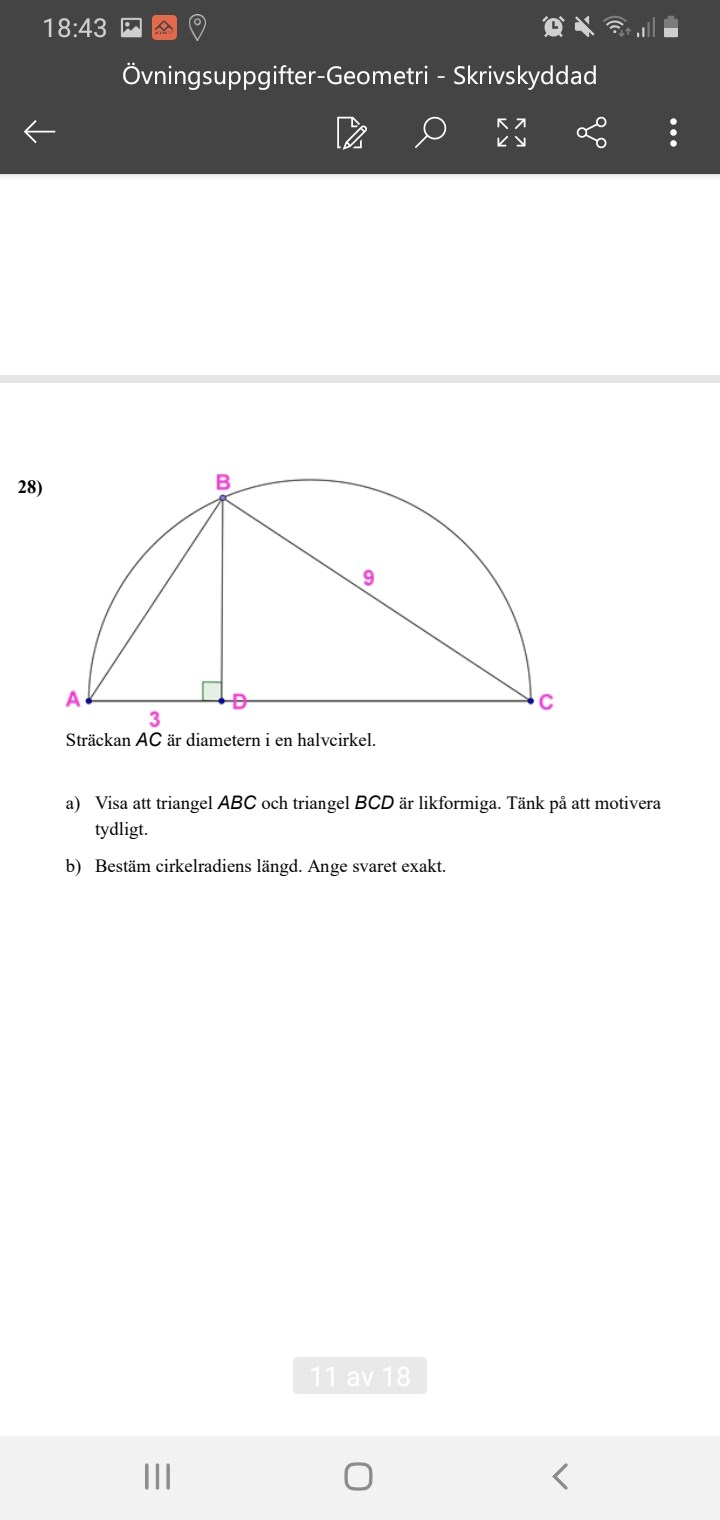 Upg a) är jag införståd på men upg b) gör mig tokig. Hur ska jag börja? Jag tänker pythagoras sats och likformighet i någon kombination men jag får inte fram något bra. Några förslag?